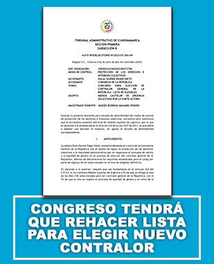 El Tribunal Administrativo de Cundinamarca ordenó al Congreso de la República rehacer la lista de 10 aspirantes a ocupar el cargo de Contralor General de la República, al considerar que la actual no cumple con equidad de género.