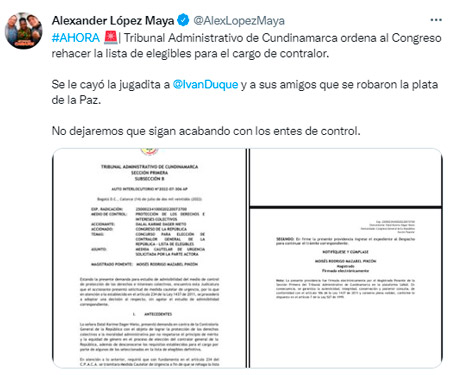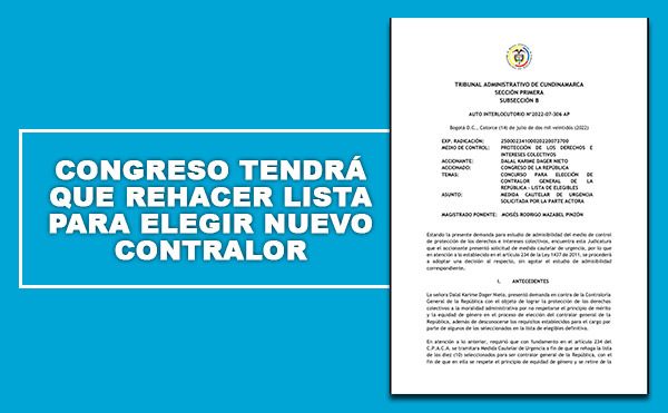 Por su parte, se conoció que el próximo lunes (18.7.2022) los 32 integrantes de la comisión accidental que viene adelantando el proceso de selección, se reunirán para examinar los alcances del fallo y probablemente pedir la revisión de la decisión del Tribunal Superior de Cundinamarca.