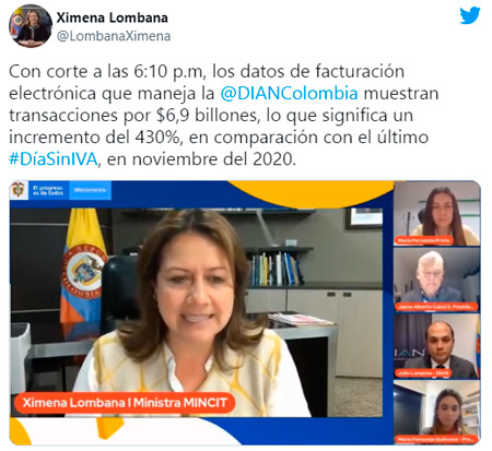La ministra Lombana manifestó sobre el "día sin IVA": “Los resultados en ventas, la cantidad de transacciones, la ausencia de problemas relacionadas con congestión o aglomeraciones, y el flujo ágil y eficiente de las transacciones, tanto en locales comerciales como en línea, nos han llevado a este resultado positivo. Agradezco a nombre del Gobierno a Fenalco, la Cámara Colombiana de Comercio Electrónico, los empresarios, las autoridades regionales, consumidores y a todas las organizaciones y personas que aportaron para este logro”.